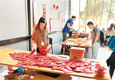 春節(jié)那天,學校為中國留學生安排了新春活動,準備了很多裝有金幣巧克力的紅包,派送的小餅干里還夾著新年祝福;不經意間,我驚喜地發(fā)現,墻面上還藏了許多謎語。對于過年還要上課的我們來說,這已是最大的“年味”了。
