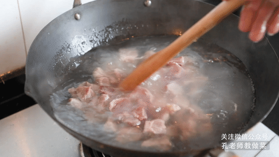 2.鍋中涼水,下入切好的牛腩,倒入料酒,煮至血水和浮沫溢出,撈出牛腩沖洗干凈。