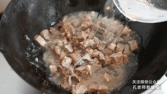 6.倒入牛腩塊,加一大碗清水,調入白糖和鹽,大火煮開后轉小火煮約30分鐘,煮至用筷子輕易戳透牛腩即可。