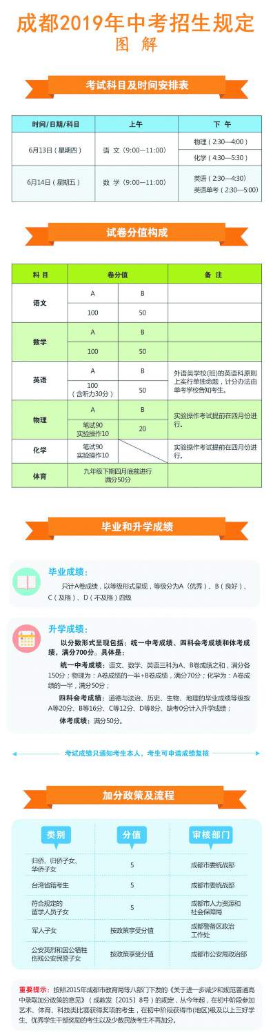 今年中考考試時間與往年一樣,為6月13日、14日,考試科目和計分辦法均未作調整。也即是說,今年中考統(tǒng)一考試科目依然為語文、數學、英語、物理、化學、體育六科。其中,物理、化學包括實驗操作考試。體育考試以及物理、化學實驗操作考試在九年級下期4月底以前,由各區(qū)(市)縣組織進行。九年級結束時,語、數、英、物、化五科的畢業(yè)考試與升學考試一并進行,各科筆試考試均為閉卷考試,具體時間安排詳見圖解。其中,外語類學校(班),如成外實外等校的英語科,原則上單獨命題,統(tǒng)一考試。