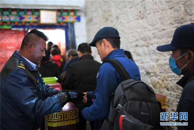 布達(dá)拉宮的安檢人員在核對(duì)參觀者的門票、身份證件等(2018年11月15日攝)。 新華社記者 普布扎西 攝