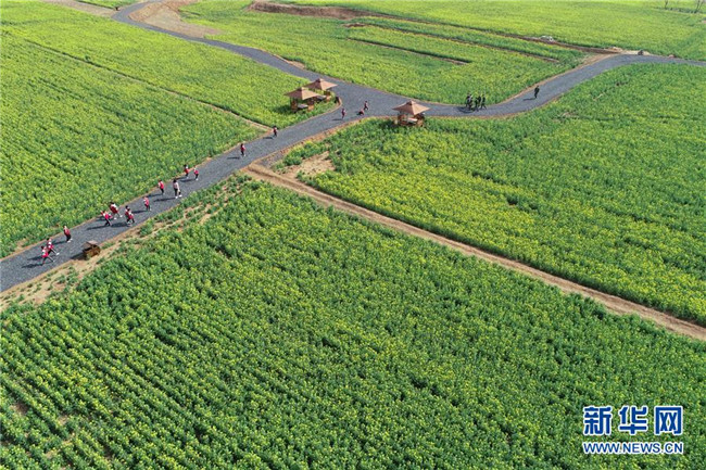 3月26日,游客在河北省沙河市東葛泉村觀賞油菜花(無人機拍攝)。