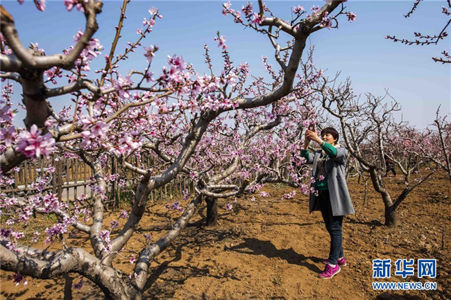 4月1日,游人在山東濰坊青州市付家村的一處桃園里拍照游玩。新華社發(fā)(王繼林 攝)