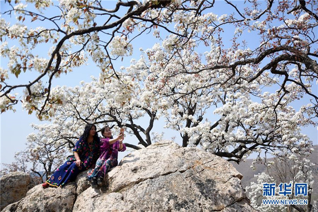4月1日,在山東省沂南縣馬牧池鄉(xiāng)西寺堡村,游客在梨園內賞花拍照。 新華社發(fā)(杜昱葆 攝)
