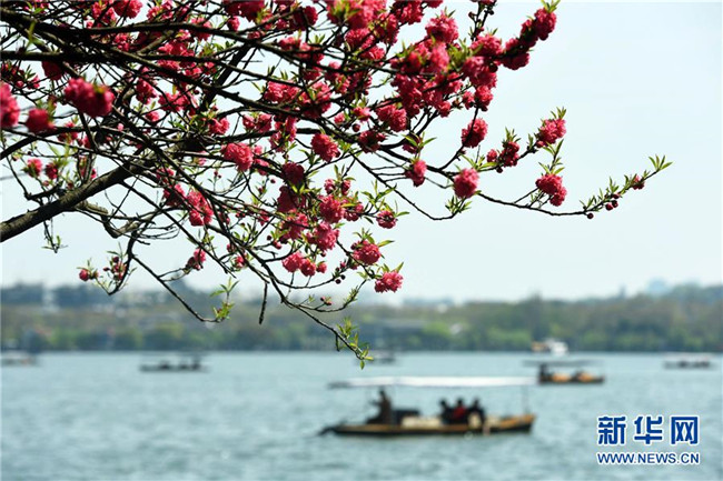 4月1日,游客在杭州西湖泛舟賞花。新華社發(fā)(龍巍 攝)