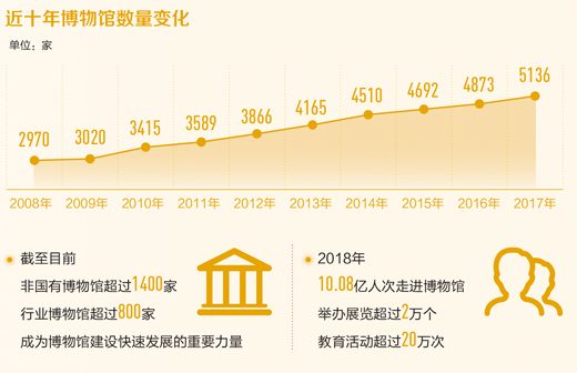 據(jù)文化和旅游部統(tǒng)計,2008年至今,我國博物館的數(shù)量呈現(xiàn)明顯加速增長之勢。截至2017年底,全國在各級政府備案的博物館達到了5136家,每年新增博物館平均在180家左右。