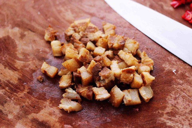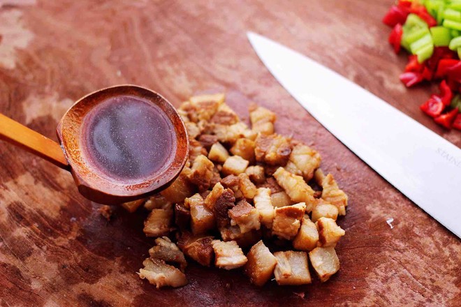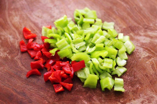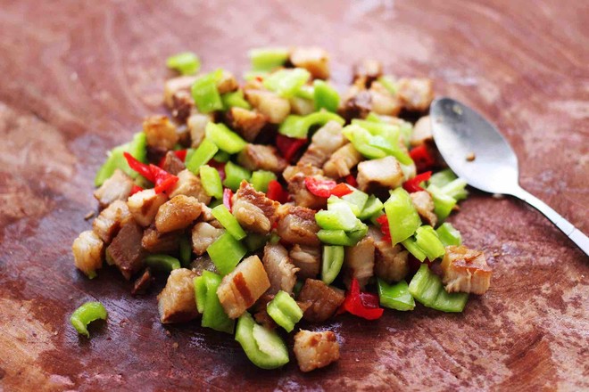 5.把切丁的青紅椒和鹵肉丁用勺子翻拌均勻備用,加點(diǎn)香菜味道會更好吃哈。