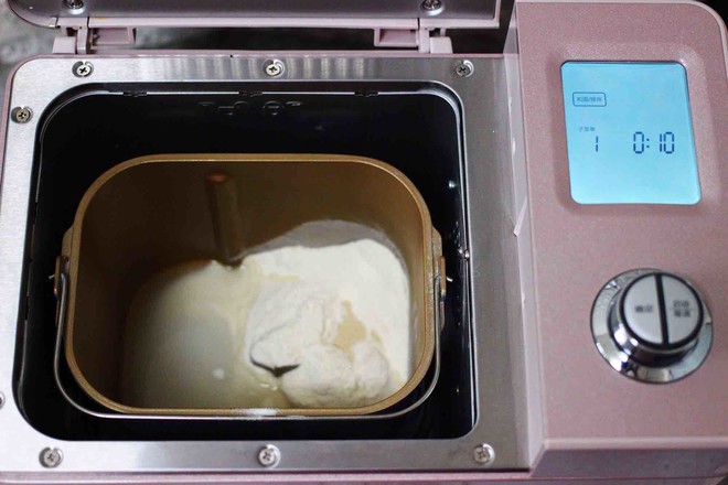 6.面包桶里加入中筋面粉,然后再加入酵母和清水,啟動?xùn)|菱面包機(jī)的一個和面程序。