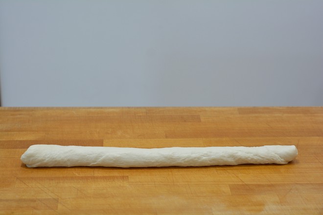 4.將餳好的面團(tuán)取出放在案板上,搓揉成長條;