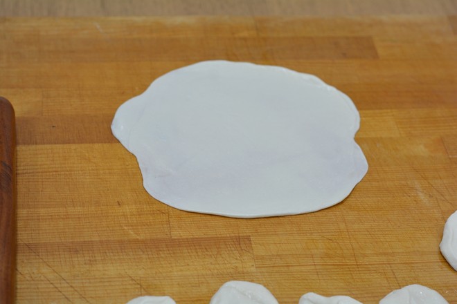 8.將幾張搟好的餅皮摞一起,取一個碗,碗口扣在餅上,用刀丸沿著碗邊將多余的餅劃掉;
