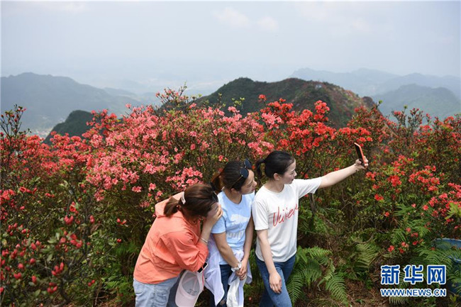 4月25日,游客在貴州省丹寨縣龍泉山景區(qū)的映山紅花間留影。暮春時(shí)節(jié),位于貴州省黔東南苗族侗族自治州丹寨縣龍泉山景區(qū)的映山紅陸續(xù)開(kāi)放,紅遍山嶺,吸引眾多游客前來(lái)賞花觀光。 新華社記者 楊文斌 攝