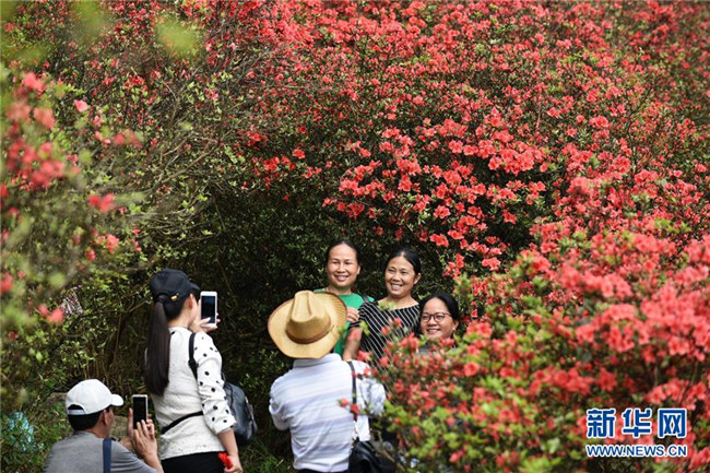 4月25日,游客在貴州省丹寨縣龍泉山景區(qū)觀賞映山紅。暮春時(shí)節(jié),位于貴州省黔東南苗族侗族自治州丹寨縣龍泉山景區(qū)的映山紅陸續(xù)開(kāi)放,紅遍山嶺,吸引眾多游客前來(lái)賞花觀光。 新華社記者 楊文斌 攝