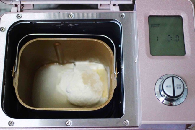 2.把稱(chēng)重的面粉和清水,放入東菱面包機(jī)里,加入酵母后,啟動(dòng)和面模式。