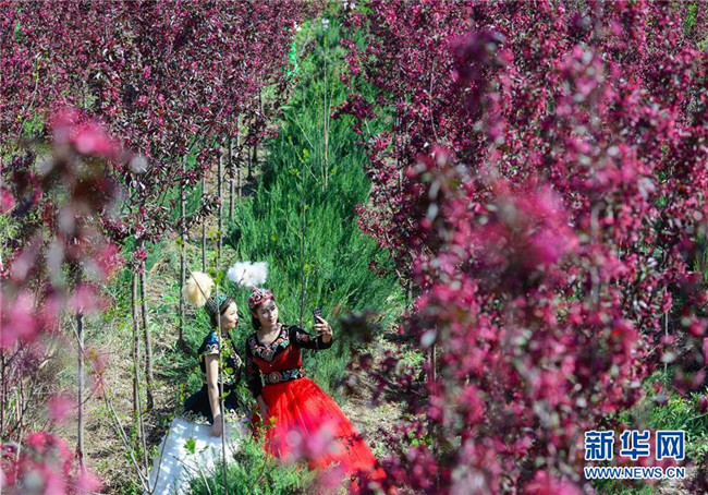 當(dāng)日,正在新疆昌吉回族自治州呼圖壁縣舉行的第四屆海棠花季鄉(xiāng)村文化旅游節(jié)吸引了眾多游客。目前,新疆天山北麓海棠花相繼綻放,進入最佳觀賞期。 新華社發(fā)(丁磊攝)