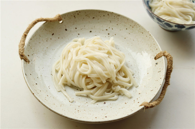 6.面條撈出來(lái)瀝干水分,根根分明,擺放在盤子里。