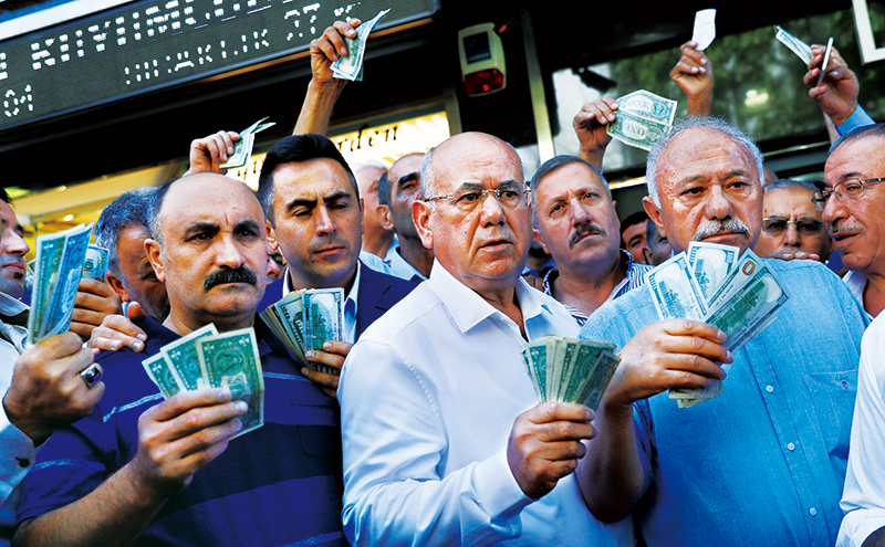 2018年,由于美聯(lián)儲加息導(dǎo)致國際游資大規(guī)模回流,美國對土耳其、伊朗進(jìn)行制裁以及貿(mào)易保護(hù)主義的影響,俄羅斯、阿根廷、土耳其、南非等不少經(jīng)濟(jì)體貨幣遭遇大幅貶值。圖為2018年8月14日,在土耳其首都安卡拉,人們響應(yīng)政府號召,手持美元站在貨幣兌換處前,出售手中的美元支持本國貨幣里拉。 新華社/路透