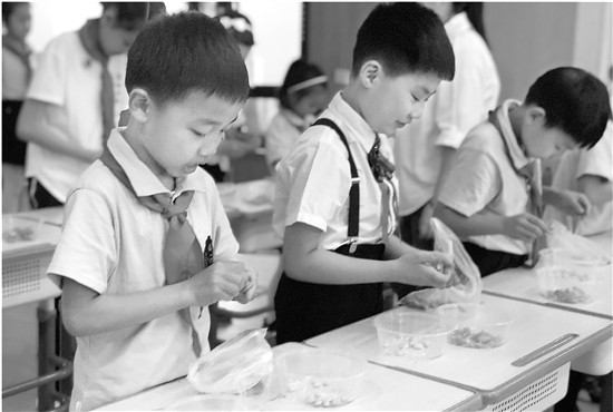 看起來,這些孩子都訓(xùn)練有素。學(xué)校二(1)班班主任袁玲玲告訴記者,一個(gè)月前,蔣校長(zhǎng)就給孩子們布置了剝毛豆的作業(yè)。
