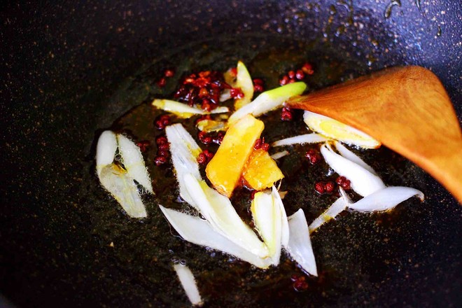 8.這個時候加入花椒和八角,小火慢慢炸出香味后,再爆香蔥姜片。