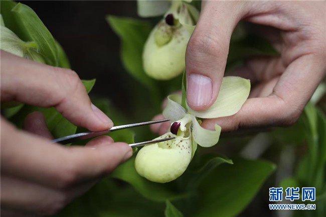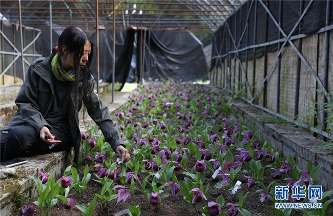 6月12日,在四川黃龍管理局花卉培育基地,四川黃龍自然保護(hù)區(qū)的高級顧問干文清在給人工保育的杓蘭標(biāo)注標(biāo)識(shí)。  新華社記者江宏景攝