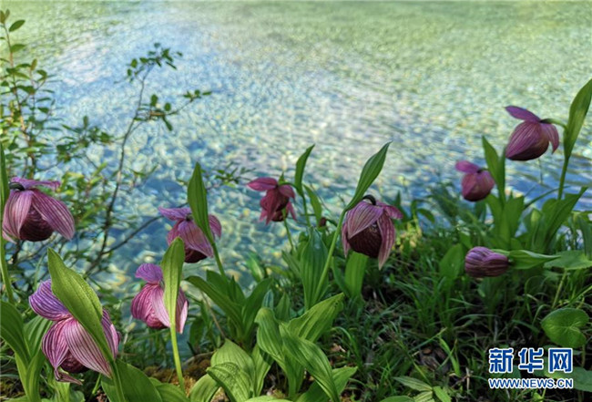 這是在四川黃龍自然保護(hù)區(qū)黃龍溝鈣化池邊拍攝的西藏杓蘭(6月12日攝)。  新華社記者江宏景攝