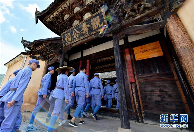 6月17日,在長汀縣南山鎮(zhèn)中復(fù)村觀壽公祠前,媒體記者在重溫當(dāng)年紅軍長征前的場景。 新華社記者魏培全攝