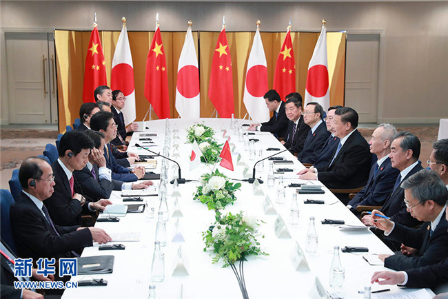 習近平強調(diào),雙方要始終恪守中日四個政治文件確立的各項原則,踐行中日“互為合作伙伴、互不構成威脅”的政治共識,增進互信,推動中日關系始終沿著和平、友好、合作的正確軌道持續(xù)向前發(fā)展。要深化經(jīng)貿(mào)、投資、第三方市場、科技創(chuàng)新等廣泛領域合作,打造新的合作增長點,積極引領區(qū)域經(jīng)濟一體化。我們歡迎日本企業(yè)積極擴大對華合作,分享中國發(fā)展新機遇。共建“一帶一路”倡議為中日互利合作開辟了廣闊天地,歡迎日方積極參與。雙方要拉緊人文紐帶,加強兩國青少年交流,促進兩國民眾相知相親。我贊同年內(nèi)啟動中日高級別人文交流磋商機制。要通過對話協(xié)商建設性管控矛盾分歧,加強外交和安全領域?qū)υ?,構建建設性雙邊安全關系。希望日方恪守迄今共識和承諾,妥善處理好歷史等敏感問題,共同維護東海和平穩(wěn)定。中日應該加強在國際和地區(qū)事務中的溝通、協(xié)調(diào)、合作,共同應對全球性挑戰(zhàn),推動全球治理更加公正合理。中方支持日方辦好二十國集團領導人大阪峰會,期待峰會發(fā)出維護多邊主義和自由貿(mào)易的明確聲音,為世界經(jīng)濟發(fā)展注入穩(wěn)定預期和動力。