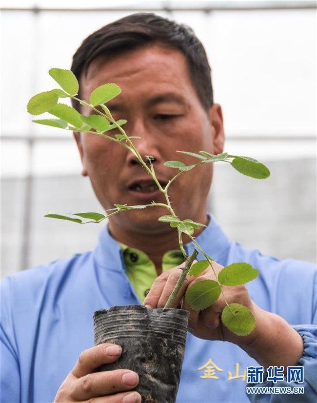 6月26日,在四川省小金縣清多香玫瑰種植專業(yè)合作社,技術人員在查看玫瑰幼苗。新華社記者 高健鈞 攝