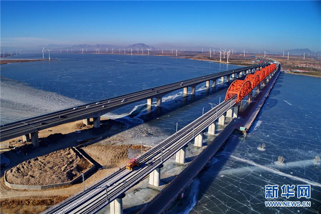 中鐵三局工人在河北張家口京張高鐵官?gòu)d水庫(kù)特大橋進(jìn)行鋪軌作業(yè)(1月13日無(wú)人機(jī)拍攝)。新華社記者 楊世堯 攝