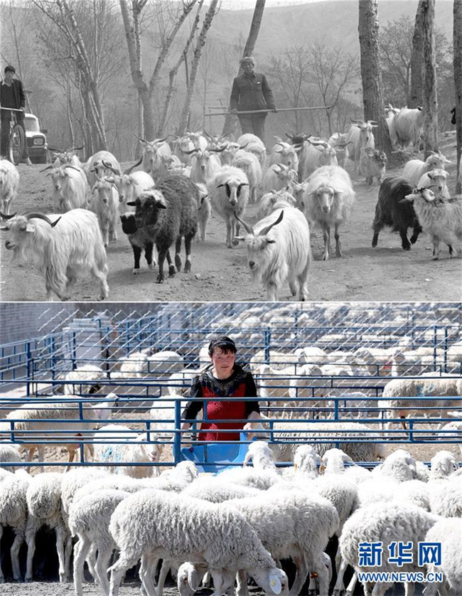 這是一張拼版照片,上圖為1993年4月27日,陜西省延安市梁村鄉(xiāng)的白生有老漢在放養(yǎng)自家的羊群(新華社記者陶明攝);下圖為2019年4月23日,延安市安塞區(qū)化子坪鎮(zhèn)河西溝湖羊養(yǎng)殖場(chǎng)的工作人員在喂羊(新華社記者劉瀟攝)。新華社發(fā)