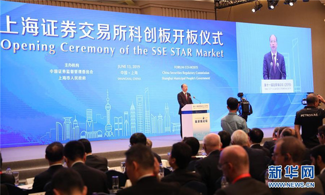 6月13日,上海證券交易所科創(chuàng)板開板儀式在陸家嘴論壇上舉行。這是中國(guó)證監(jiān)會(huì)主席易會(huì)滿在開板儀式上致辭。新華社記者 方喆 攝