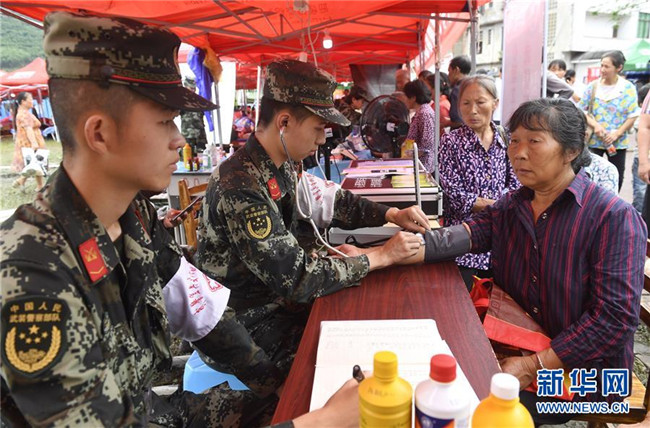 在四川長(zhǎng)寧地震災(zāi)區(qū)安置點(diǎn),武警宜賓支隊(duì)衛(wèi)生隊(duì)黨小組成員為群眾提供醫(yī)療服務(wù)(6月20日攝)。新華社記者 劉坤 攝