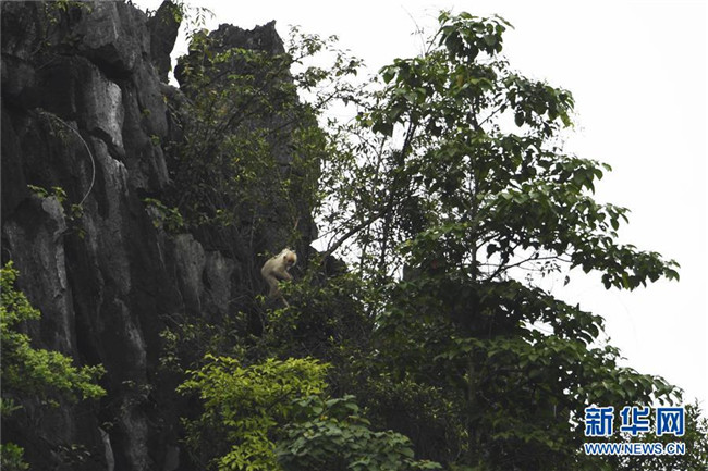 7月4日,白化黑葉猴幼體出現(xiàn)在廣西大新縣桃城鎮(zhèn)寶新村城南小學(xué)后山上。新華社記者 曹祎銘 攝