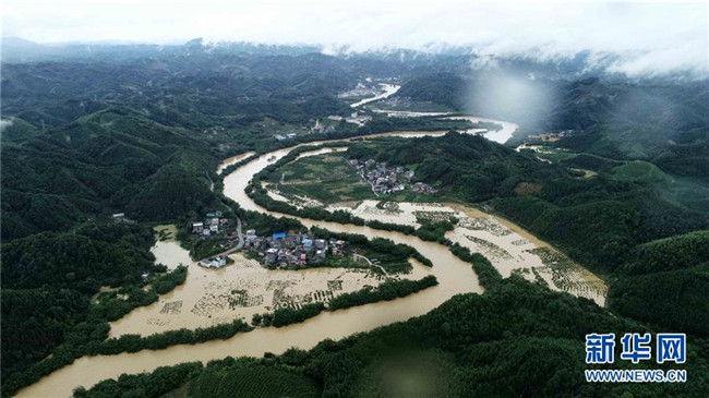 7月9日,廣西柳州市融安縣大將鎮(zhèn)部分地區(qū)被洪水淹沒(無人機(jī)拍攝)。新華社發(fā)(譚凱興 攝)