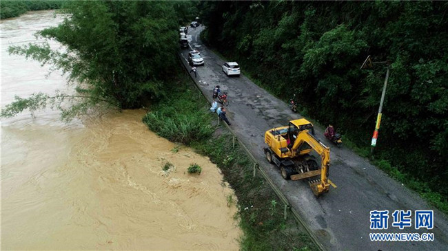 7月9日,在廣西柳州市融安縣大將鎮(zhèn)東潭村,一輛工程車輛在受災(zāi)地區(qū)待命,準(zhǔn)備搶修受損道路(無人機(jī)拍攝)。新華社發(fā)(譚凱興 攝)