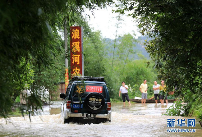 7月9日,在廣西柳州市融安縣長安鎮(zhèn)和寨村,車輛通過積水路段。新華社發(fā)(譚凱興 攝)