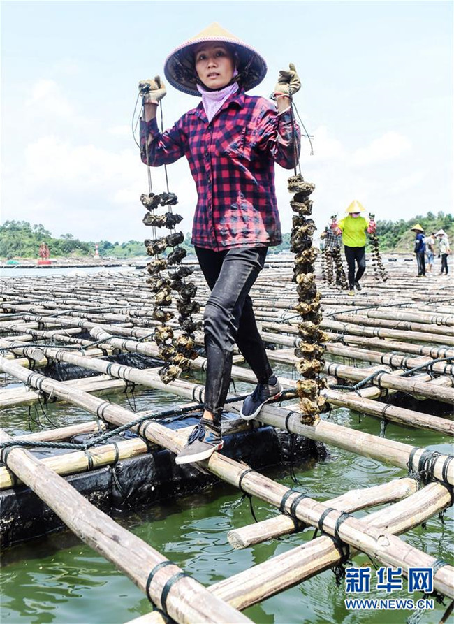 村民在蠔排上提取蠔柱收獲大蠔(7月20日攝)。 新華社記者 張愛林 攝