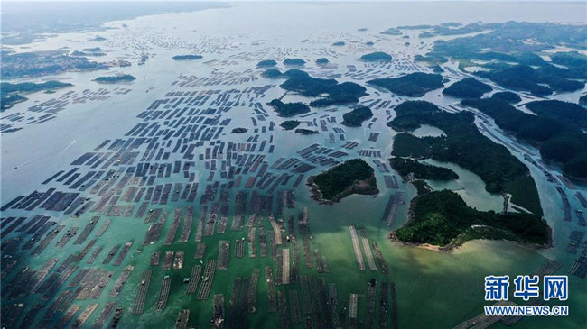 這是無人機拍攝的欽州市以七十二涇海域為中心的連片萬畝大蠔養(yǎng)殖基地(7月20日攝)。 新華社記者 張愛林 攝