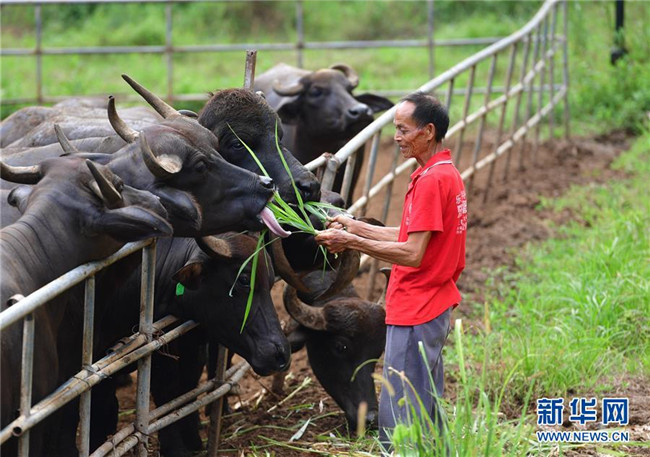 在廣西融安縣大良鎮(zhèn)古蘭村古蘭屯養(yǎng)?;兀?8歲的韋肇翠在喂牛(8月18日攝)。韋肇翠是養(yǎng)牛基地的飼養(yǎng)員,每個(gè)月有2800元的工資。 新華社記者 黃孝邦 攝