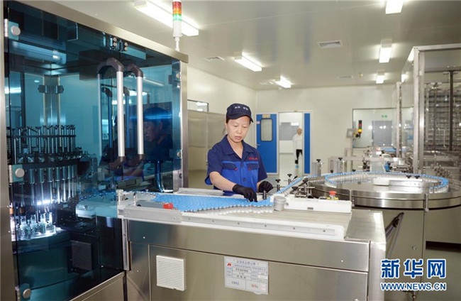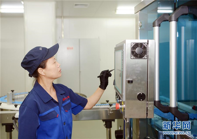吉林敖東藥業(yè)集團(tuán)延吉股份有限公司燈檢線操作工朱秀芳在操作全自動凍干粉針偵檢機(jī)(8月22日攝)。新華社發(fā)