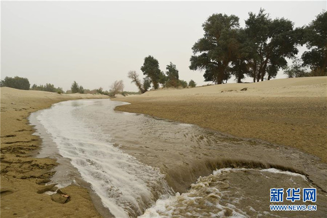 生態(tài)水流過(guò)干涸的河床,滋養(yǎng)著兩岸的胡楊(8月25日攝)。 新華社記者 阿曼 攝