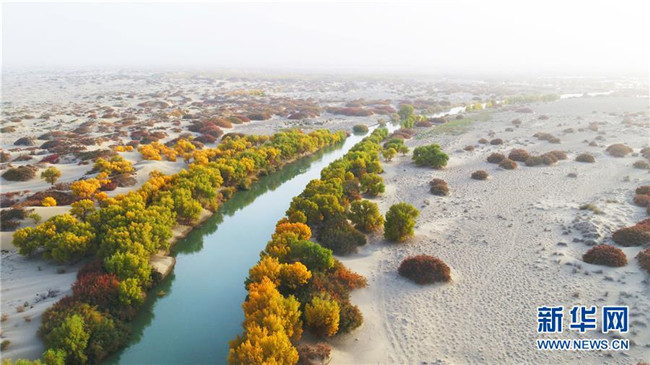 生態(tài)水滋養(yǎng)著塔里木河下游河道兩岸的胡楊,阻止了塔克拉瑪干與庫(kù)姆塔格兩大沙漠合攏(2017年10月15日無(wú)人機(jī)拍攝)。 新華社發(fā)(肖玉磊 攝)