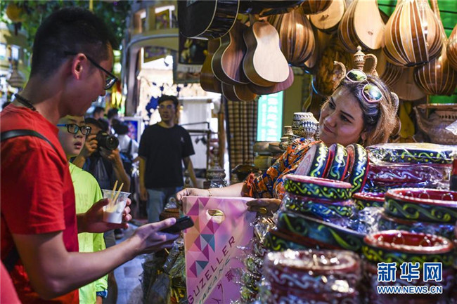 在位于烏魯木齊的大巴扎景區(qū),游客在觀光購(gòu)物(8月8日攝)。 新華社記者 王菲 攝