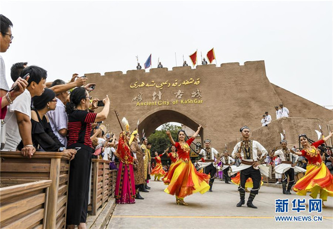 游客在新疆喀什古城景區(qū)開(kāi)城儀式上觀看歌舞表演(8月13日攝)。 新華社記者 王菲 攝
