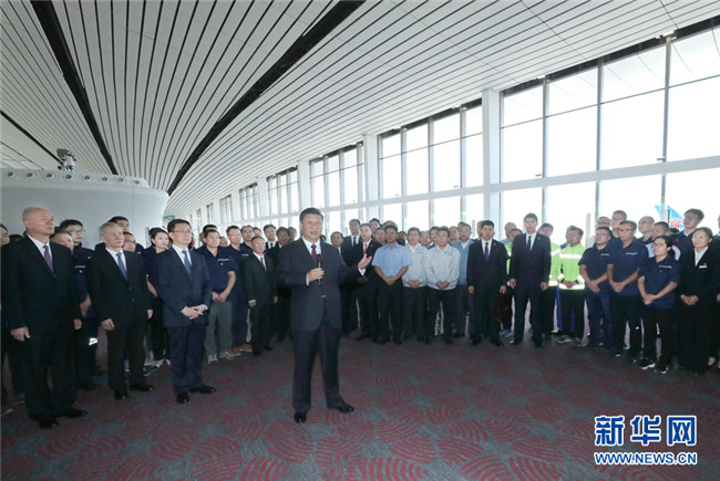 習(xí)近平強(qiáng)調(diào),大興國際機(jī)場能夠在不到5年的時(shí)間里就完成預(yù)定的建設(shè)任務(wù),順利投入運(yùn)營,充分展現(xiàn)了中國工程建筑的雄厚實(shí)力,充分體現(xiàn)了中國精神和中國力量,充分體現(xiàn)了中國共產(chǎn)黨領(lǐng)導(dǎo)和我國社會主義制度能夠集中力量辦大事的政治優(yōu)勢。新中國70年何等輝煌!中國共產(chǎn)黨領(lǐng)導(dǎo)中國人民實(shí)現(xiàn)了一個(gè)又一個(gè)“不可能”,創(chuàng)造了一個(gè)又一個(gè)難以置信的奇跡。奇跡是干出來的,社會主義是干出來的。中國共產(chǎn)黨和中國人民有雄心、有自信繼續(xù)奮斗,朝著實(shí)現(xiàn)“兩個(gè)一百年”奮斗目標(biāo)、實(shí)現(xiàn)中華民族偉大復(fù)興的中國夢奮勇前進(jìn)。實(shí)踐充分證明,中國人民一定能,中國一定行。