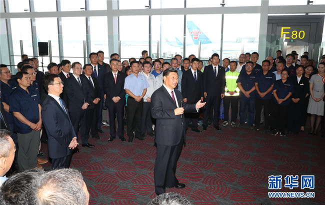 大興機(jī)場航站樓,是目前全球最大規(guī)模的單體航站樓,以其獨(dú)特的造型設(shè)計(jì)、精湛的施工工藝、便捷的交通組織、先進(jìn)的技術(shù)應(yīng)用,創(chuàng)造了許多世界之最。航站樓里,流線型的空間結(jié)構(gòu)十分寬敞明亮。習(xí)近平步行巡覽站臺大廳和值機(jī)大廳,實(shí)地了解值機(jī)、安檢、登機(jī)和殘疾人無障礙設(shè)施等情況,并結(jié)合沙盤和模型聽取機(jī)場總體規(guī)劃、設(shè)施建設(shè)等介紹。習(xí)近平強(qiáng)調(diào),大興國際機(jī)場是首都的重大標(biāo)志性工程,是推動京津冀協(xié)同發(fā)展的骨干工程。京津冀三地要抓住機(jī)遇加強(qiáng)協(xié)同合作,加快推動地區(qū)高質(zhì)量發(fā)展。民航業(yè)是國家重要的戰(zhàn)略產(chǎn)業(yè)。要建設(shè)更多更先進(jìn)的航空樞紐、更完善的綜合交通運(yùn)輸系統(tǒng),加快建設(shè)交通強(qiáng)國。