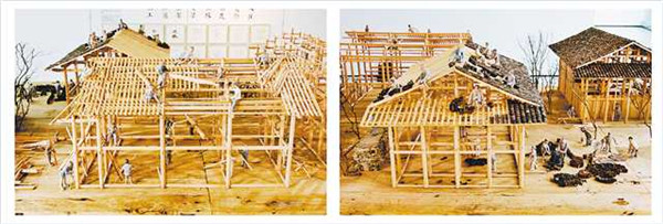 “作品分為動工、排扇、立架、安梁、上椽、排瓦、裝修、入住8個部分,再現(xiàn)了中國民間木匠的工藝傳統(tǒng)和中國傳統(tǒng)民居營建過程。”孫繼任介紹,為了讓作品呈現(xiàn)樸素而真實的美感,他們沒有在作品中運(yùn)用釘子或者新材料。“作品全部是純手工制作,建筑為榫卯結(jié)構(gòu),人物是手工塑造并用木柴燒制而成。”