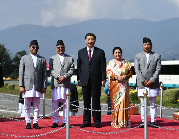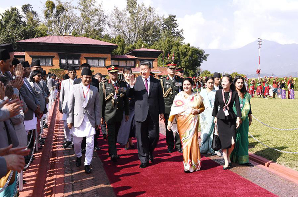 10月12日,國家主席習(xí)近平乘專機抵達(dá)加德滿都,開始對尼泊爾進行國事訪問。尼泊爾總統(tǒng)班達(dá)里在機場為習(xí)近平舉行具有濃郁尼泊爾民族特色的歡迎儀式。新華社記者高潔攝