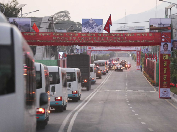 10月12日,尼泊爾首都加德滿都,車隊經(jīng)過一道道迎賓拱門。新華社記者丁林?jǐn)z