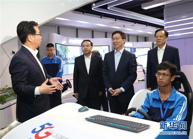 10月14日至15日,中共中央政治局常委、國務院副總理韓正在重慶市調(diào)研。這是10月15日,韓正來到禮嘉智慧公園,了解園區(qū)開發(fā)建設情況,體驗智能機器人和5G技術在遠程駕駛、教育、旅游等方面的應用。 新華社記者 劉衛(wèi)兵 攝