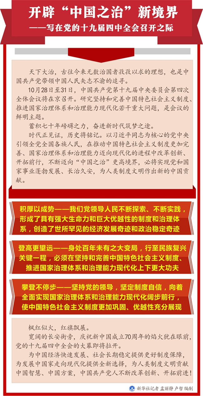10月28日至31日,中國共產(chǎn)黨第十九屆中央委員會第四次全體會議將在京召開。研究堅(jiān)持和完善中國特色社會主義制度、推進(jìn)國家治理體系和治理能力現(xiàn)代化若干重大問題,是會議的鮮明主題。